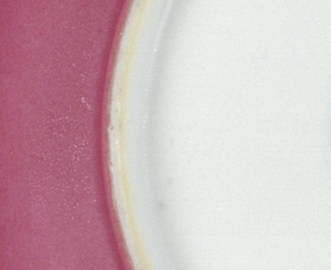 胭脂紅釉採用吹釉工藝,以竹筒蒙紗將釉漿吹噴於胎體表面,真品經2至3次吹釉疊加,在圈足內牆與外壁交界處可見密集的不規則斑點,10至20倍放大鏡下呈鋸齒狀或點狀分佈,而非一條直線,釉層薄而均勻,僅0.1至0.3毫米。仿品多為一次厚施釉,胎釉交界處呈生硬直線,無吹釉斑點,釉層過厚且手感笨重。胎質方面,真品官窯選用高品質瓷石,淘洗精細,圈足露胎處呈「糯米白」質感——白中微泛青,細膩如糯米粉,並可見細密均勻的螺旋修胎痕跡。康熙胎薄堅緻,雍正最薄處可達1毫米,乾隆後漸厚。仿品胎色要麼死白(現代瓷土),要麼泛黃(做舊),無螺旋紋或紋路雜亂。圈足露胎與釉面交接處,真品因鐵質長期自然氧化形成薑黃色火石紅,由內而外深淺不一,邊緣呈自然暈散,與胎體融為一體無法刮除。仿品則多為人為塗抹的「一線紅」,顏色浮於表面、整齊劃一,可輕易刮除。