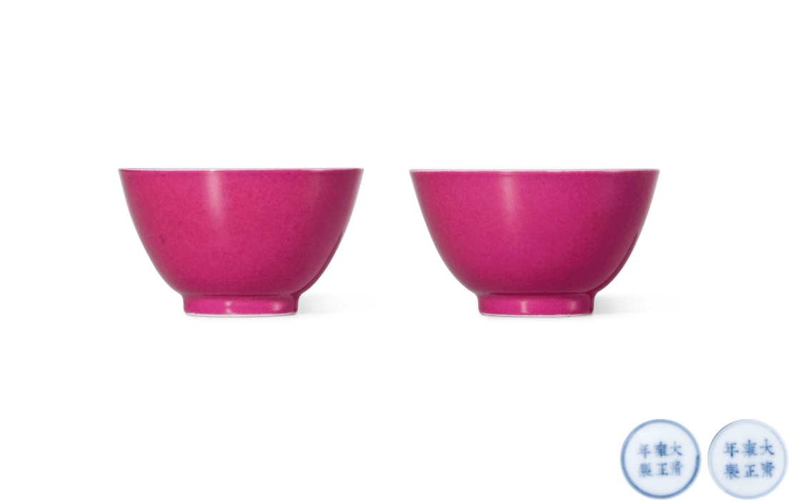 從近年拍賣市場表現來看,胭脂紅瓷器的市場熱度持續攀升,尤其是康雍時期的御窯精品,屢創天價,成為藏家競逐的焦點。2019年佳士得秋拍中,一件清康熙御製胭脂紅地琺瑯彩千葉蓮紋盌以8720萬港元成交;2023年中國嘉德春拍中,一對清雍正內洋彩瑞果紋外胭脂紅釉杯,以1046.5萬元人民幣成交,創下雍正朝胭脂紅小件瓷器的市場高價。