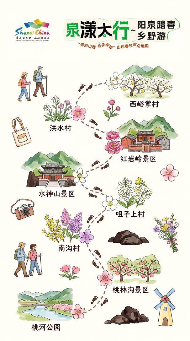 沿途景点:榆社云竹湖景区(连翘、山桃)—平遥古城(樱花、紫叶李)—太谷凤凰山景区(山杏、连翘)—昔阳大寨森林公园(桃花)