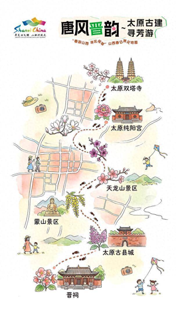 沿途景点:晋祠(迎春、连翘、桃花、玉兰)—太原古县城(迎春、桃花、樱花)—蒙山景区(山桃花、连翘)—天龙山(桃花)—纯阳宫(丁香)—双塔公园(桃花、海棠)