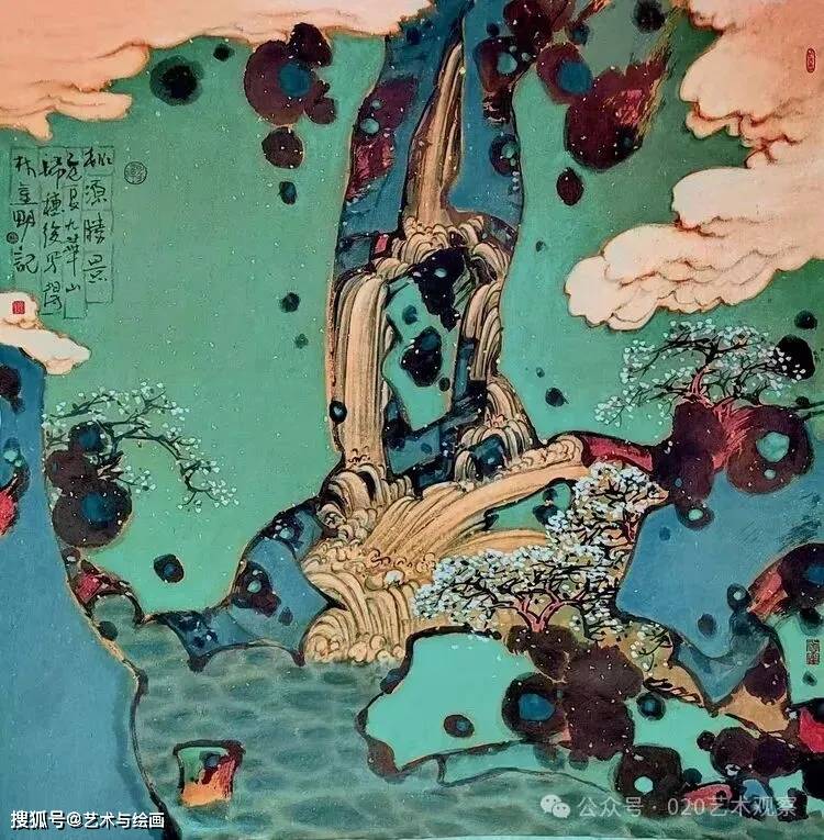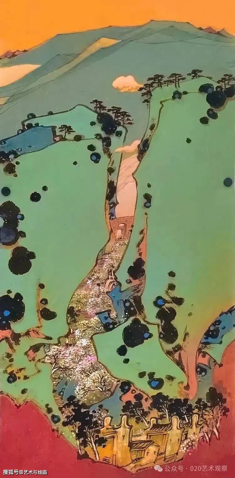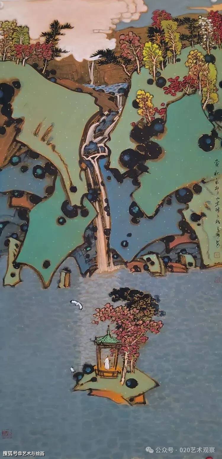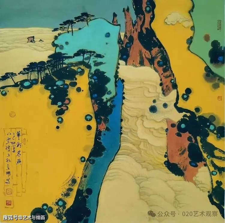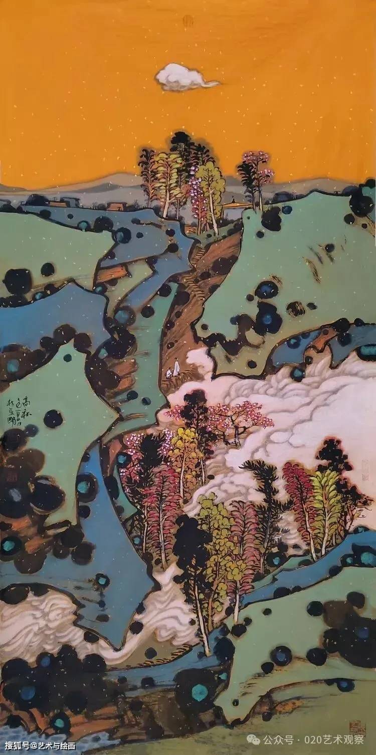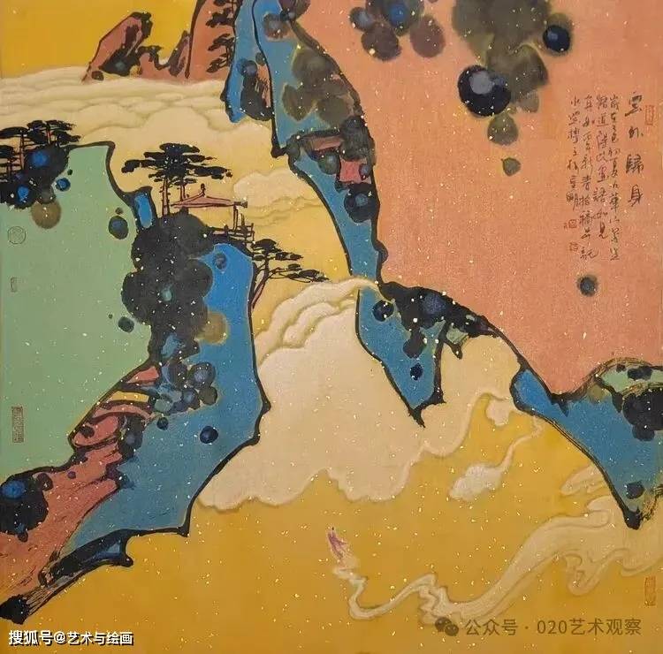 艺术的高度是达到离形去知,画家要摆脱习惯的造型模式,要远离循常的认知和陈旧的经验。我们看毕加索,达利等大师的作品,会感到陌生不解,是因为大师离形去知,我们还是旧叶障目。金明梦后新作是有离形去知味道的,总体感觉就不是他以前的画风了。以他梦醒的一作品独辟蹊径观之,变化明显。一是以前常画的树,亭宇,人物,云水等都不见了,是个空寂世界,见出佛家色空观。二是山已非山,基本是大色块的组合,有西方抽象意味,与青绿传统着色远矣。三是抽象的书法点线别有意味,是点,是树,是石,是人,还是其他,任君想象。聊说三点,可见其离形去知后的变化。鱼龙变化峥嵘,金明艺术前景可期。后生可畏啊!