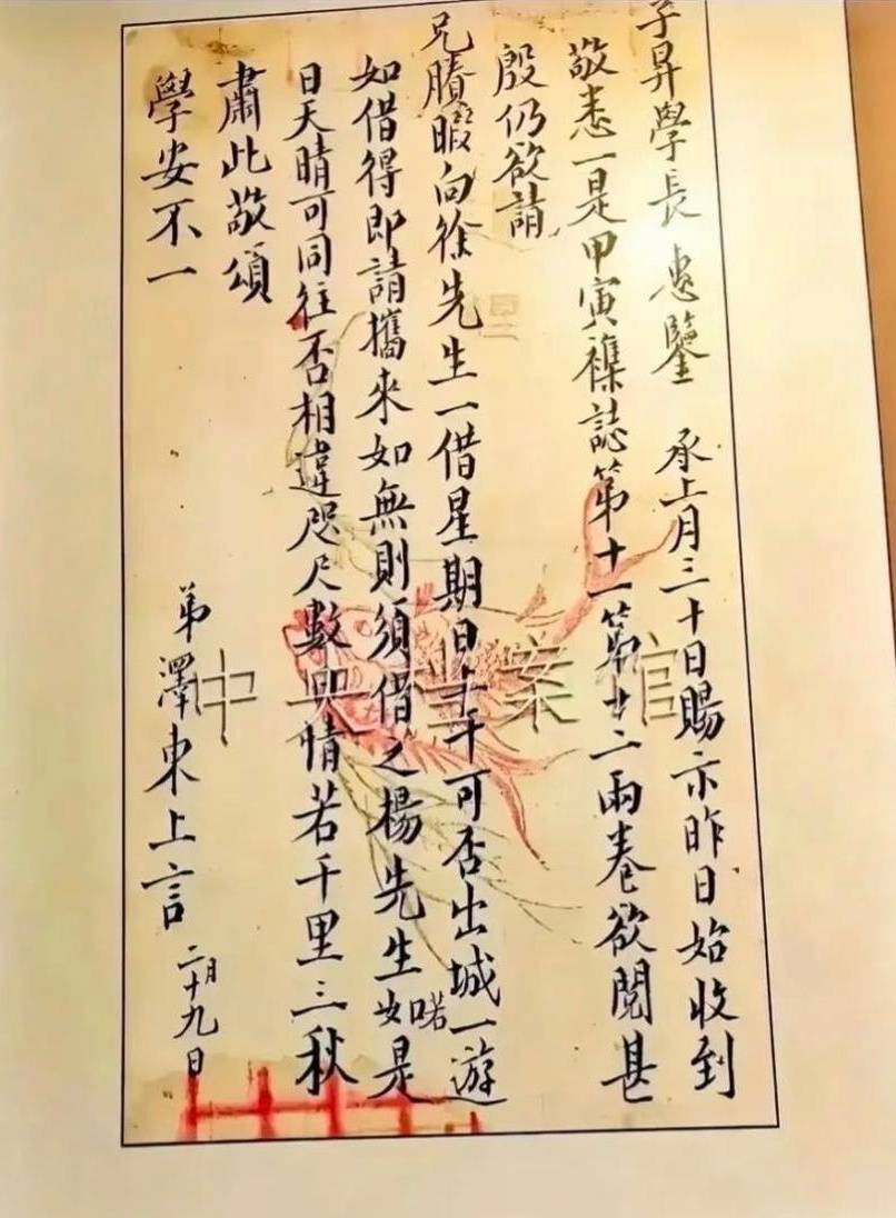 承上月三十日赐示,昨日始收到,敬悉一是。《甲寅》杂志第十一、第十二两卷,欲阅甚殷,仍欲请兄剩暇向徐先生一借,星期日上午可否出城一游?如借得,即请携来,如无,则须借之杨先生,如若是日天晴,可同往否?相违咫尺数日情若千里三秋。