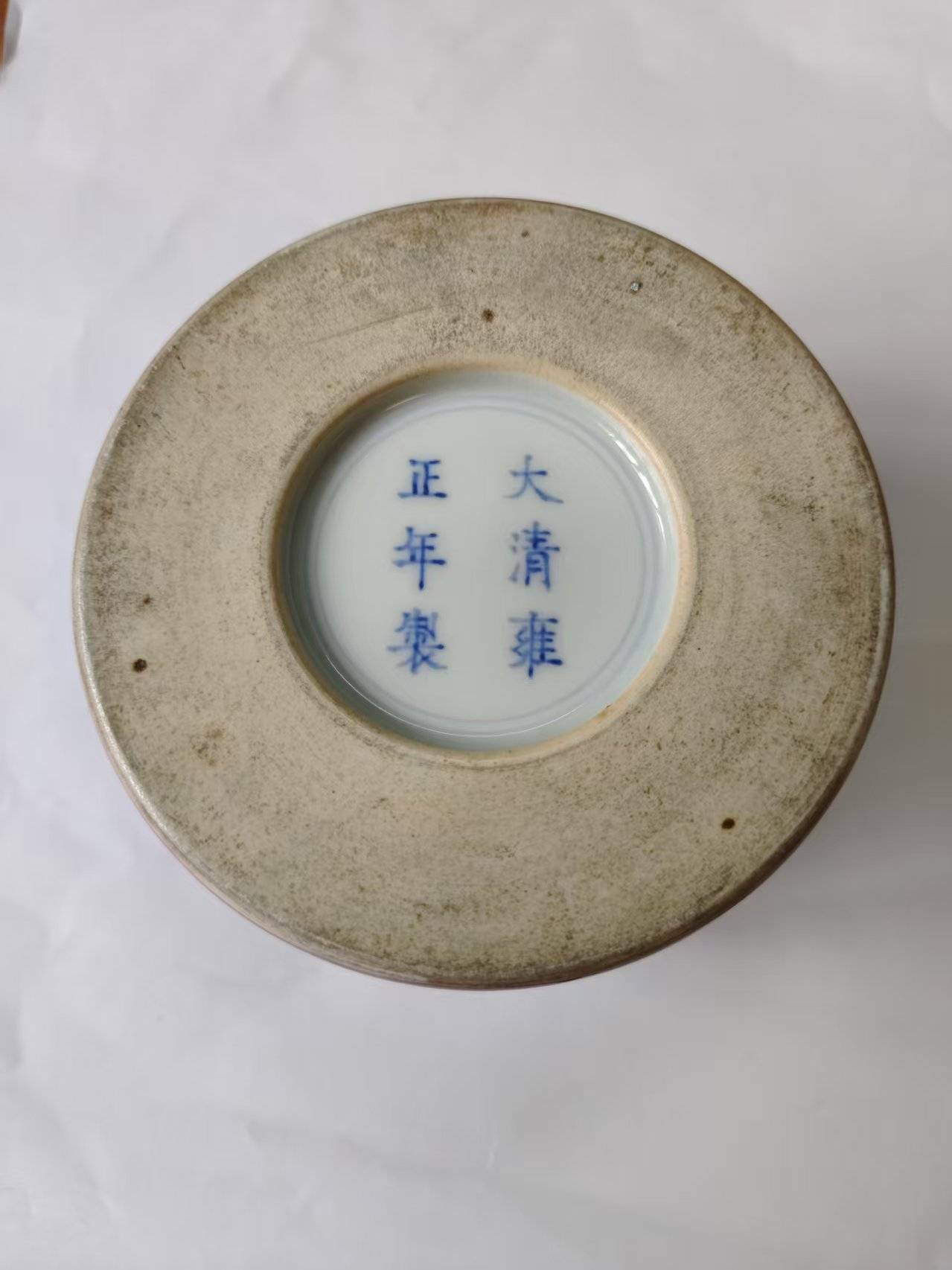 水丞底足玉璧底内,以青花书**“大清雍正年制”六字双行楷书款**,外围青花双圈,字体规整端庄,笔画清晰有力,是雍正官窑标准款识。款识青花发色纯正浓艳,呈色稳定,书写遵循清代官窑款识规范,位置居中,布局严谨,是鉴定雍正官窑瓷器的核心依据,彰显了御窑厂的制器标准。