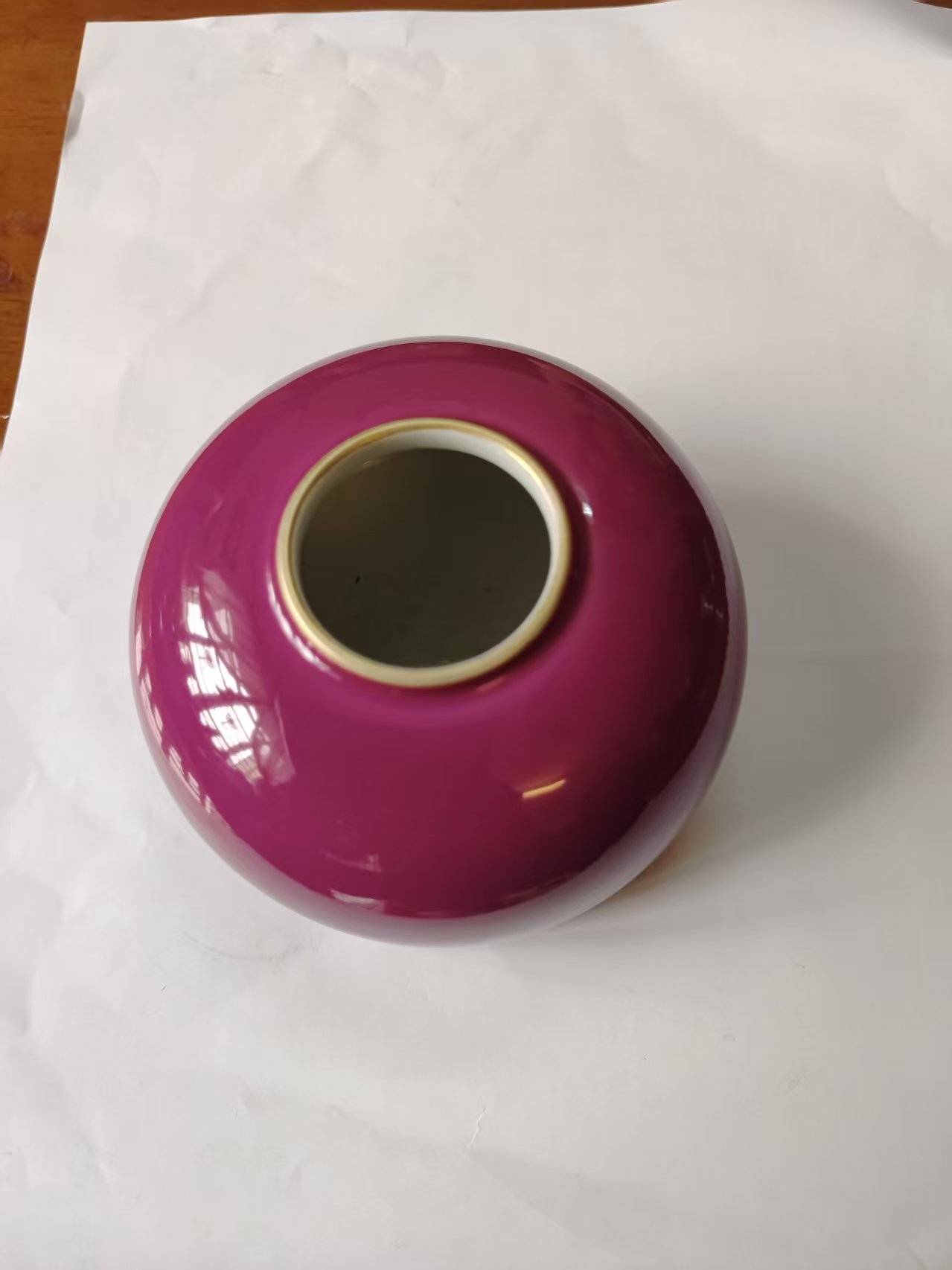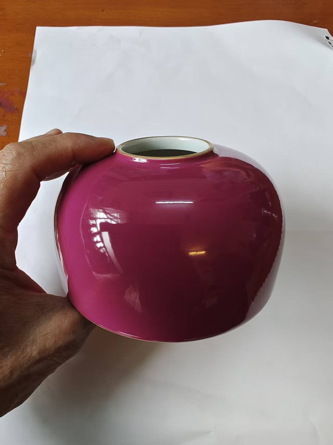胎体采用景德镇顶级高岭土烧制,胎骨坚致细腻,洁白缜密,胎体厚薄均匀,叩之声音清脆悦耳,尽显雍正官窑“胎如白玉”的品质。釉面通体施玫瑰红釉(胭脂紫釉),釉色浓艳纯正,呈色均匀饱满,如玫瑰初绽、胭脂凝脂,光泽柔和内敛,温润如玉,无流釉、缩釉、针孔等瑕疵,是雍正金红釉的顶级呈色。