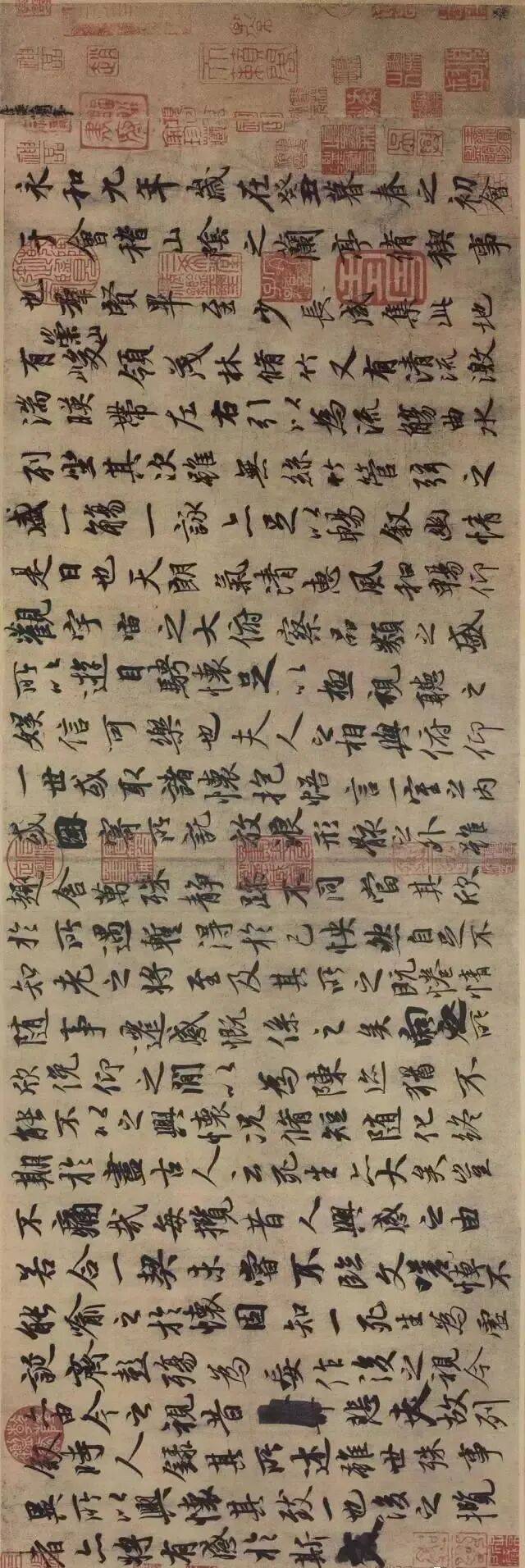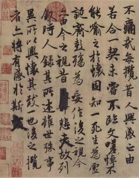 据说,该序是当年王羲之一挥而就草拟的一篇序文。第二天羲之准备抄写成正稿时,反复抄写都觉得气韵布局和笔画结构都不如草稿。他又是惊奇又是苦恼:一是为自己的书法所惊喜,二是草稿太多涂改,不好拿去见人啊!