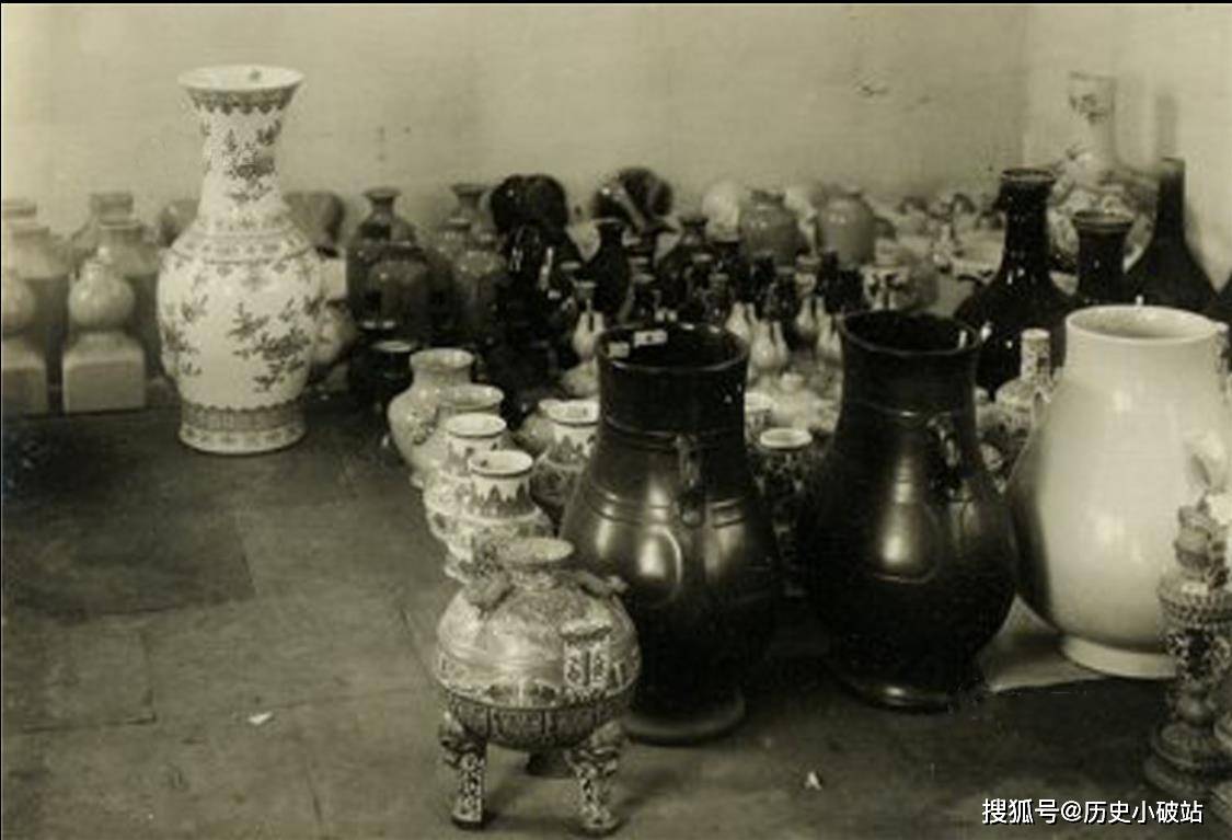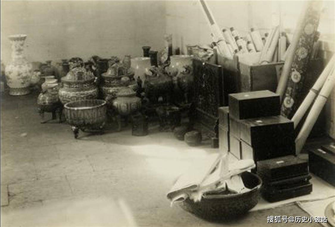 1933年,故宫文物南迁前夕,各类宫廷珍宝在库房内集中待装箱,库房内堆满了明清宫廷珍藏的各类国宝。左侧与中间是高大的粉彩瓷瓶、三足鼎式香炉、青铜尊等重器,右侧是成捆的卷轴书画、堆叠的黑漆木匣。