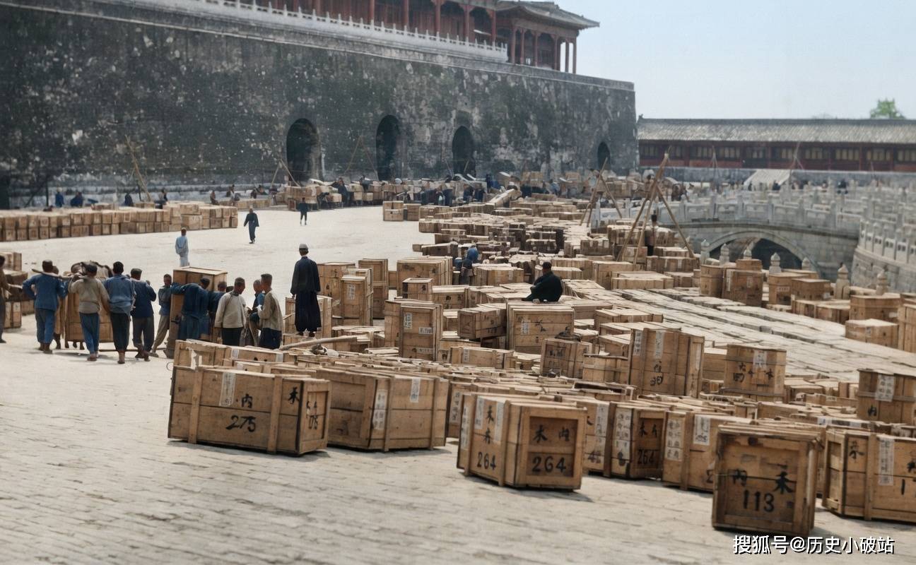 1933年,故宫午门前,堆满了即将南迁的文物木箱,一眼望不到头。箱子上清晰可见编号(如`275`、`264`、`113`)与分类标识(如“内”“禾”等字样),这些是当时为了清点、区分文物类别而做的标记。