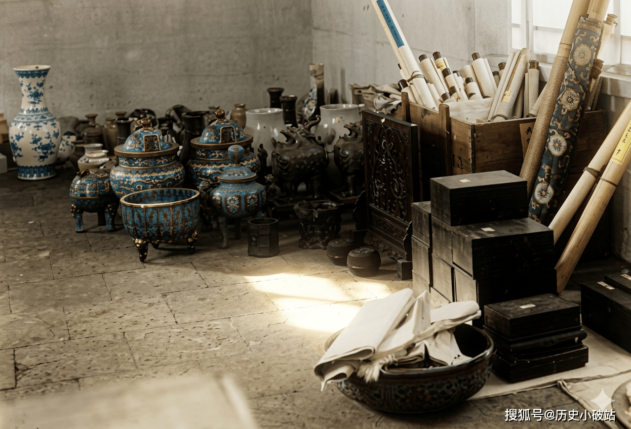 文物并非杂乱堆放,而是按品类大致分区,旁边散落着衬纸、棉絮、木箱等包装材料,说明已完成初步清点,即将进入防震装箱环节。