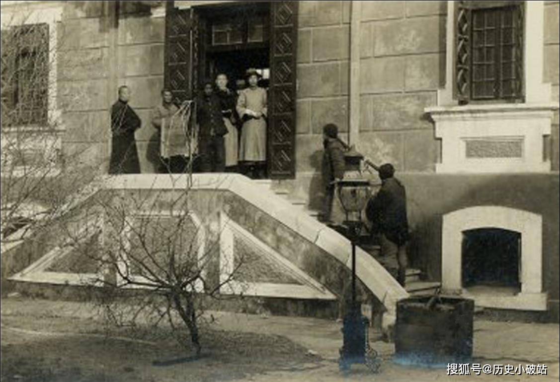 这是一栋民国时期的西式砖石建筑,台阶与门窗都带着近代风格,冬日枯树暗示了这是个寒冷时节,台阶上,几位身着长衫的男子是故宫博物院的工作人员,他们站在门口值守监督,确保文物搬运流程规范、无遗失或损坏。