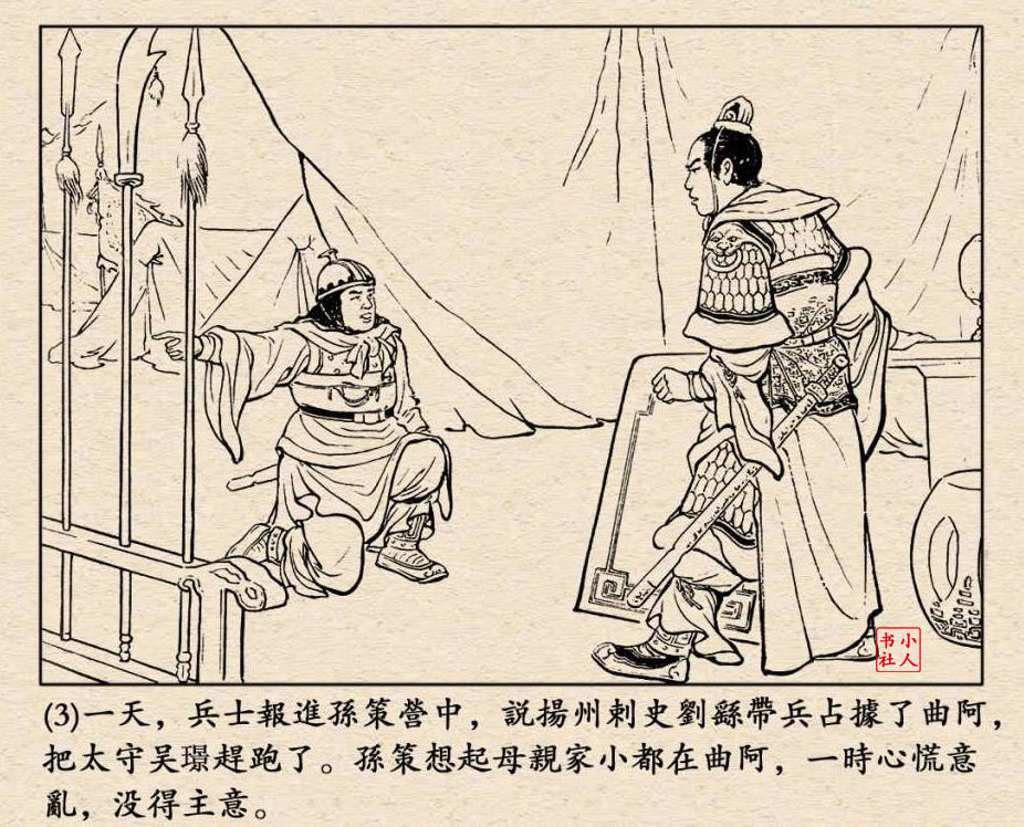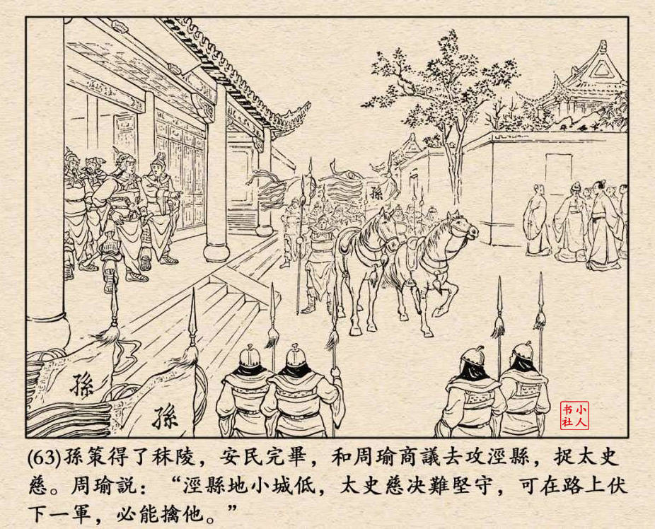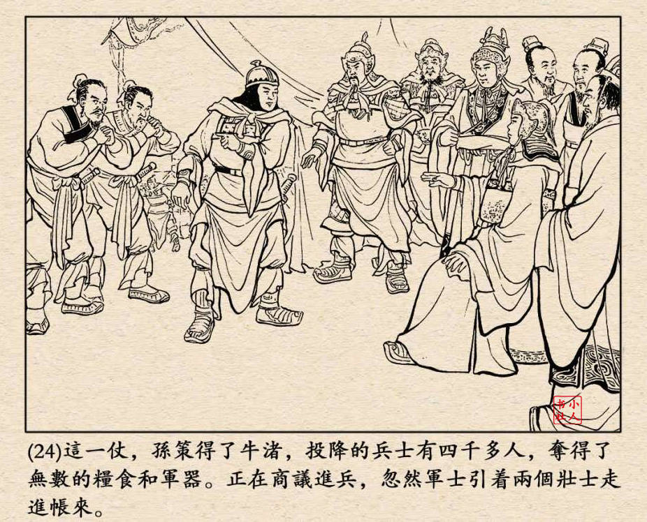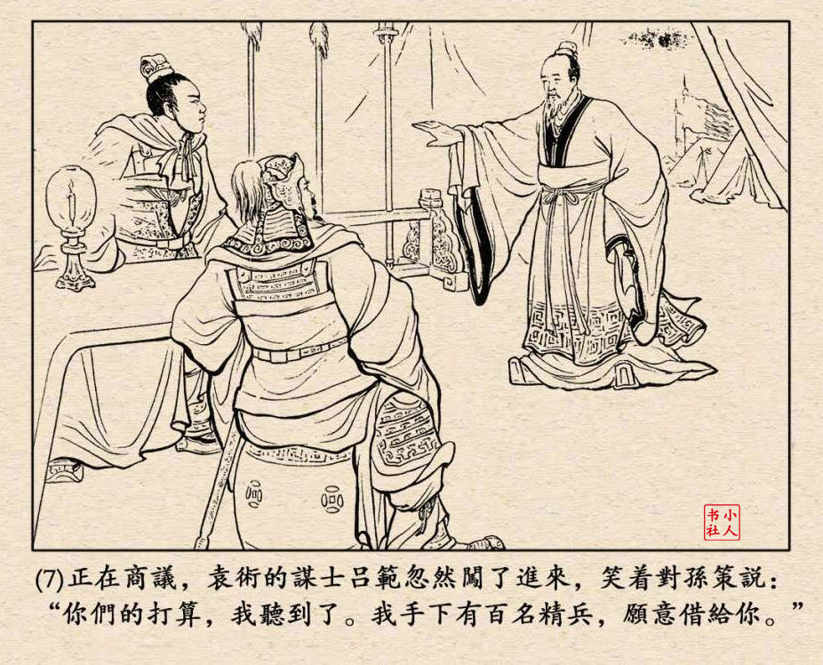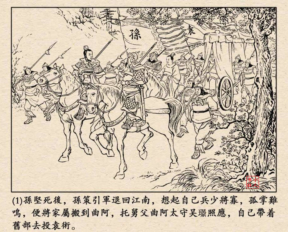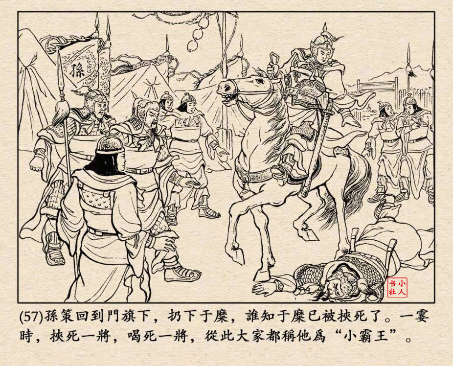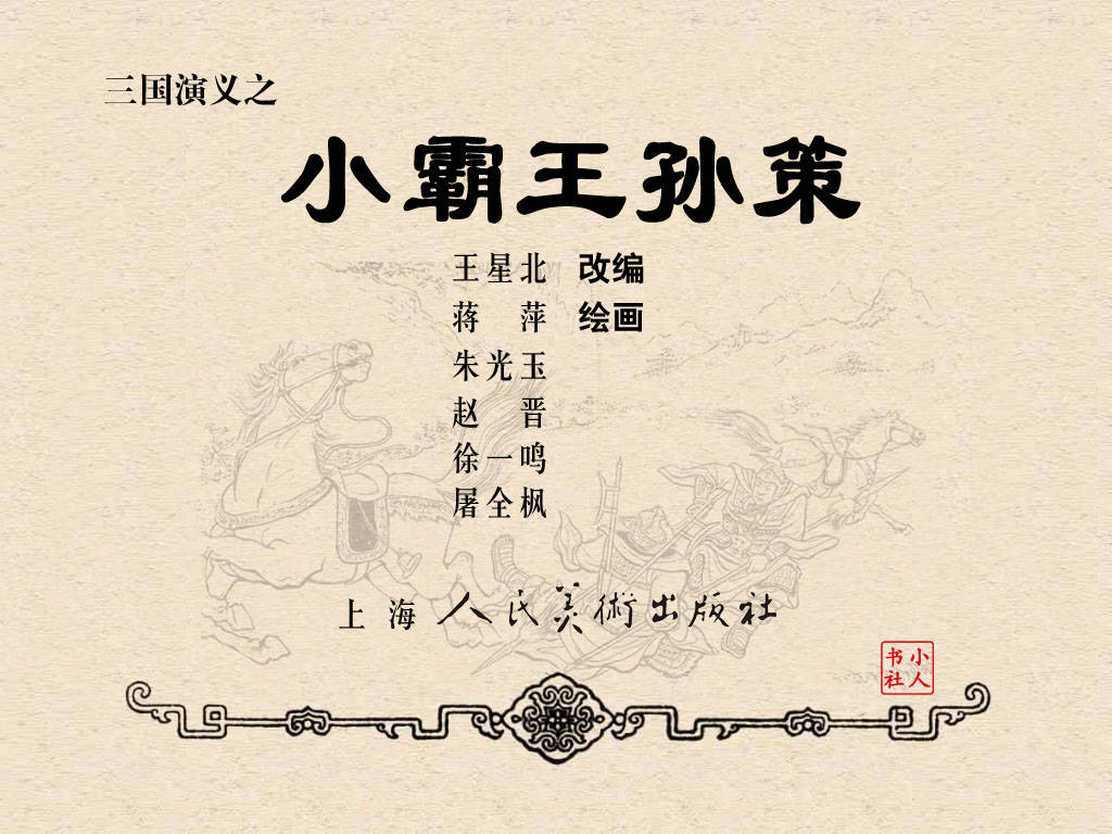 《小霸王孙策》连环画是由王星北、蒋萍改编,朱光玉、赵晋绘画。故事讲述孙坚的儿子孙策在死了父亲之死,继领兵马,击败扬州刺史刘繇,攻吴郡,克会稽,据有江东六郡,勇猛英武,人称“小霸王”。后来在西山射猎,遇刺殒命。他的弟弟孙权继承了他的事业,重用周瑜和鲁肃,造成了三国鼎立的局面。