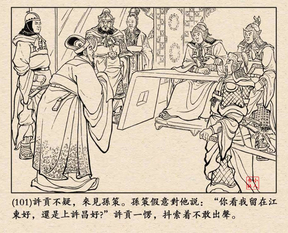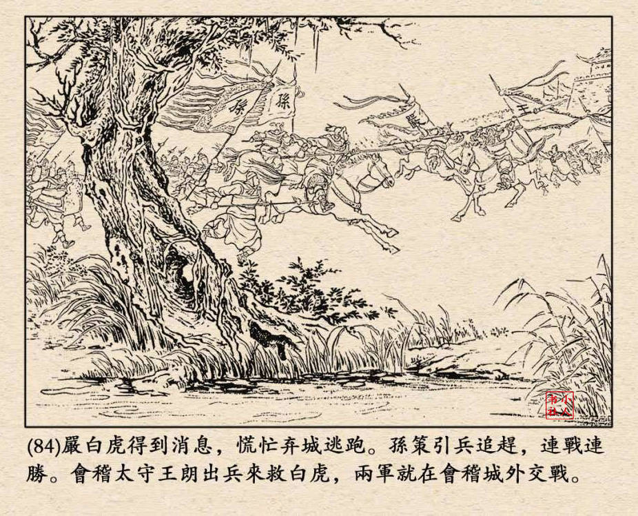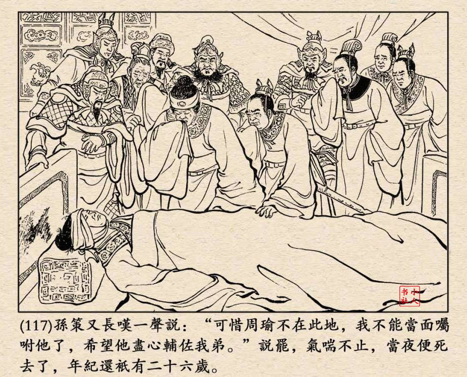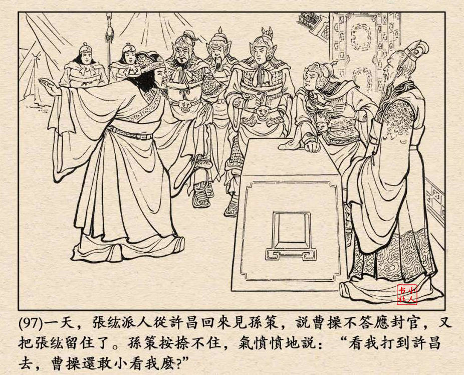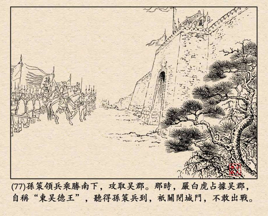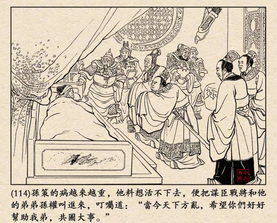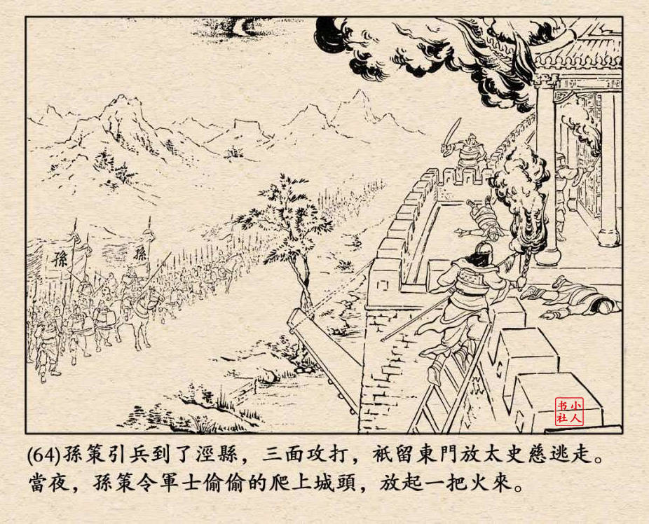 《小霸王孙策》连环画是由王星北、蒋萍改编,朱光玉、赵晋绘画。故事讲述孙坚的儿子孙策在死了父亲之死,继领兵马,击败扬州刺史刘繇,攻吴郡,克会稽,据有江东六郡,勇猛英武,人称“小霸王”。后来在西山射猎,遇刺殒命。他的弟弟孙权继承了他的事业,重用周瑜和鲁肃,造成了三国鼎立的局面。