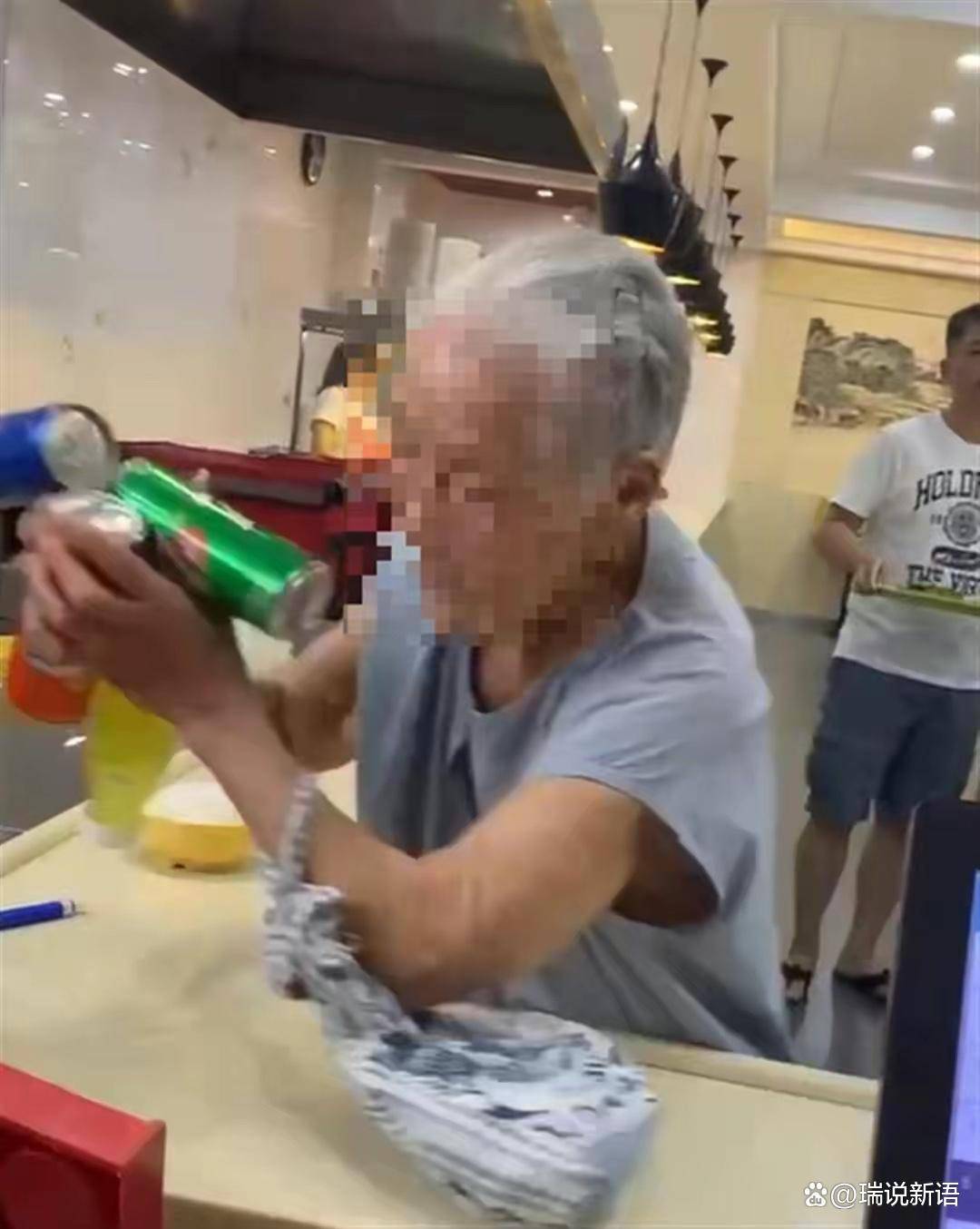 网友称当时老太太站在收银台处,先是推倒了桌面上的饮料,随后又狠摔其他物件,还将手伸进菜盘里。