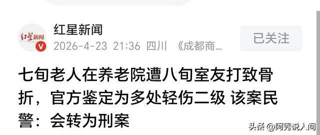 最近内蒙古有个事挺让人生气,大伙儿都看不下去了。4 月 10 日阿鲁科尔沁旗养老院,73 周岁老人住进去,被 85 岁室友狠狠打了。因一句反驳,人倒地骨折缝针。说是安全地方,咋变伤人窝?到底谁管管。报警的时候都说了详情,但感觉院方还是很冷漠。