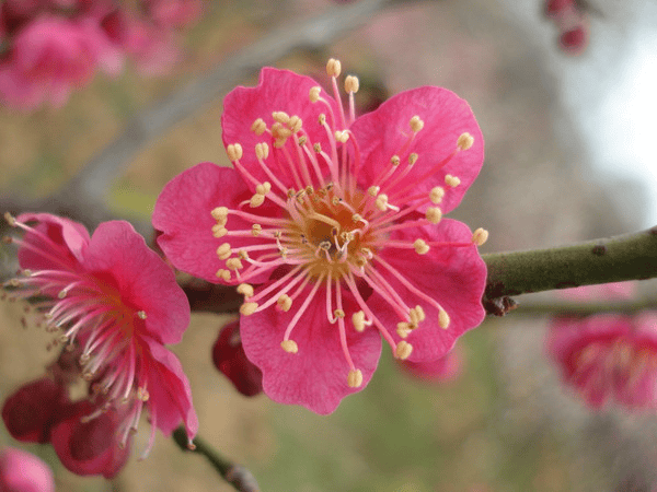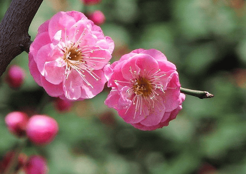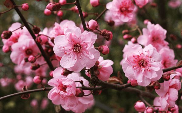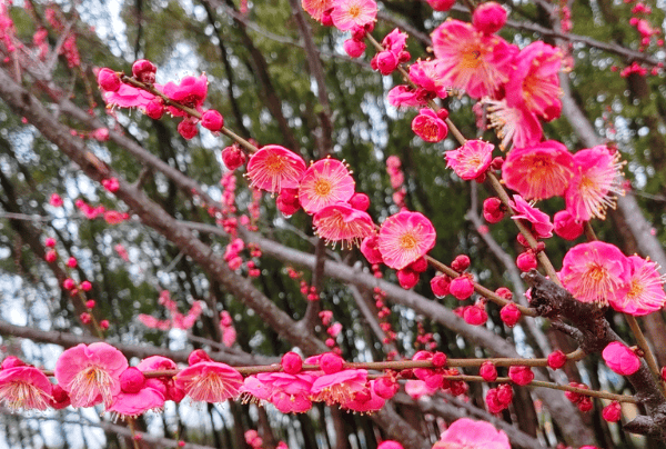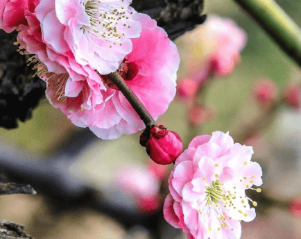 2. 宫粉品种群:这是园艺中应用最广泛、数量最多的品种群。花复瓣或重瓣,花色从淡粉到玫瑰红,深浅不一,如云霞铺锦,是“红梅”的主要构成部分。