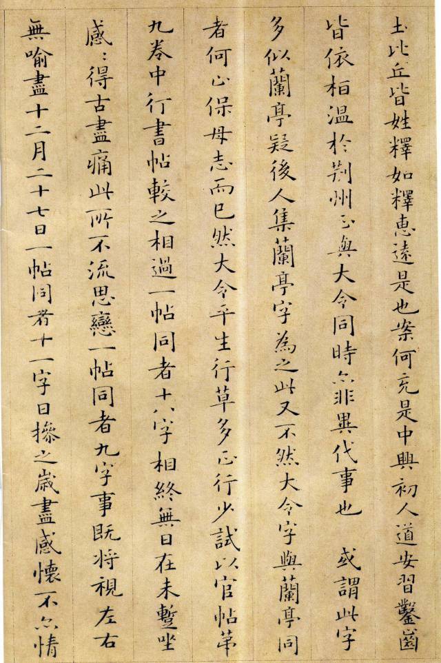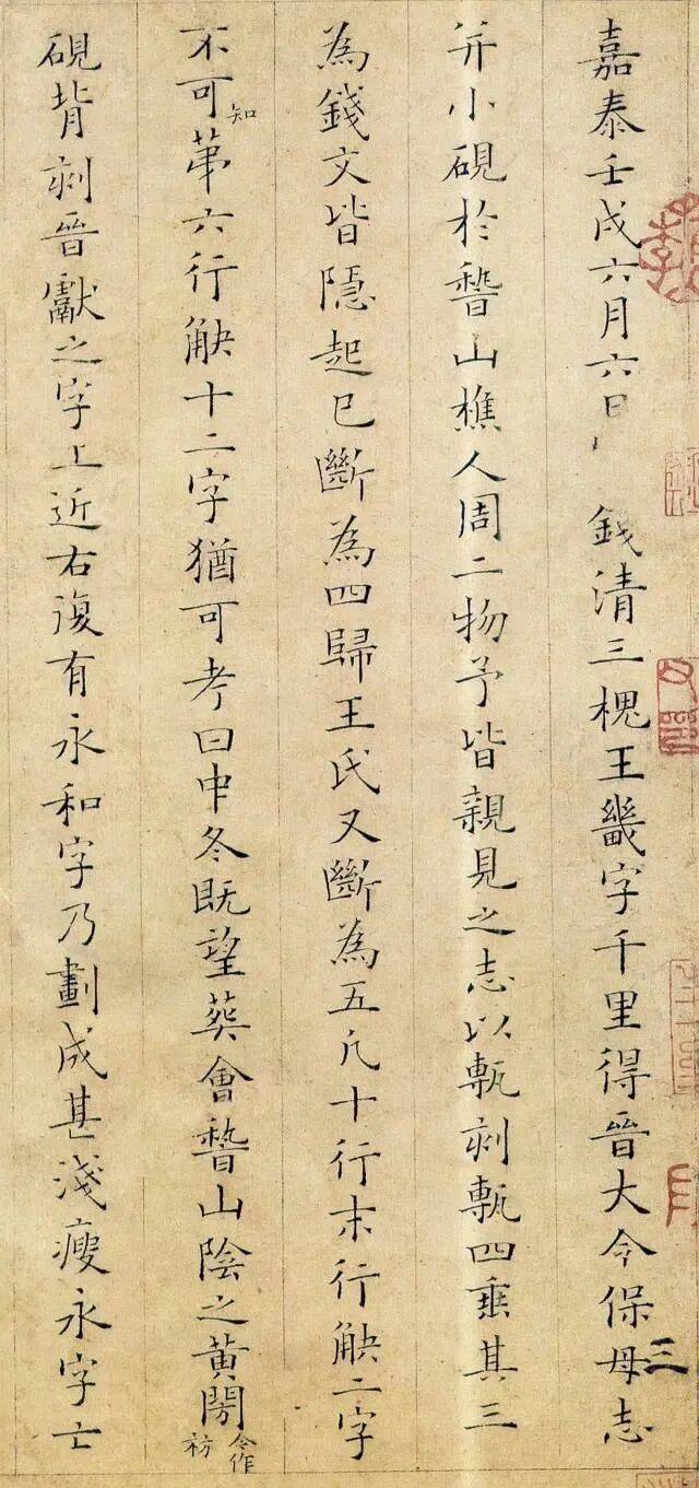 姜夔《跋王献之保母帖》,小楷。纸本,三百一十六毫米,全文计一百零一行,现藏于故宫博物院。姜夔传世墨迹不多。