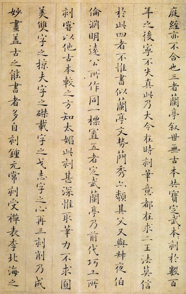 姜夔“崇晋贬唐”,反对俗书,和提倡文人意趣的苏东坡、黄庭坚、米芾等相一致。但他对“唐法”并非不问青红皂白一概予以否定,而是用了大量篇幅对“法”进行了系统的、全面的论述,并从肯定和解释引申了“晋韵”古法。他传世墨迹不多。从《小楷跋王献之保母帖》中可以看出他的书法出于二王一路,用笔精到,典雅俊润,且受初唐诸家书风影响,不随时俗,清新脱俗。