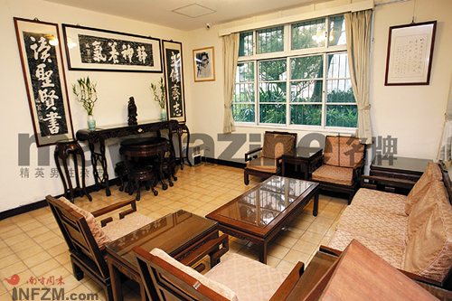 客厅里挂有两幅对联和一幅条幅:对联之一是朱熹晚年自撰联的拓本,另一幅则是钱先生的自撰联;条幅落款“蒋中正”,上书一个“寿”字,洒金红笺、黑字、白绫装裱。钱穆先生在台湾两蒋时期地位很高,一度被蒋介石尊为“国师”。