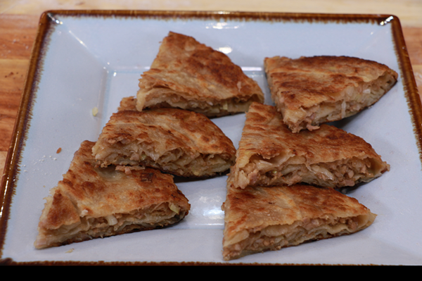 肉馅制作好以后,就到了关键的折千层饼的步骤,将醒好的面揉成光滑的面团,擀成较薄的面皮,将肉馅均匀地涂抹于面皮上,用刀切出刀口,注意不要切断,然后折叠起来,用擀面杖轻轻擀薄,注意用力要均匀,一点一点擀开,不要过猛,最后放到平底锅里,两面各烙5分钟左右就可以啦!