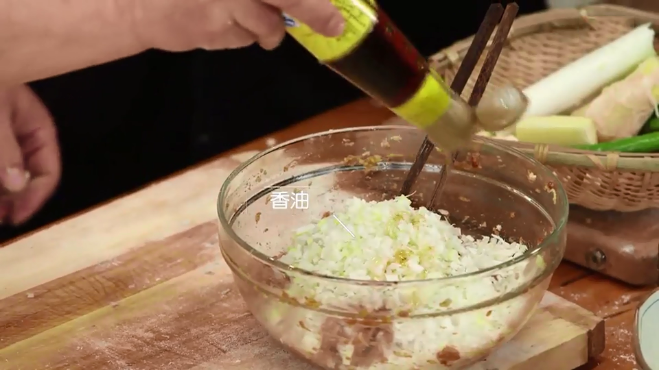 2.姜切碎,拌在猪肉馅儿(3分肥7分瘦)里,加料酒、盐、糖、胡椒粉、酱油搅拌均匀,大葱切碎,拌进肉馅里,加香油锁住葱味;
