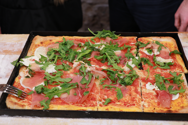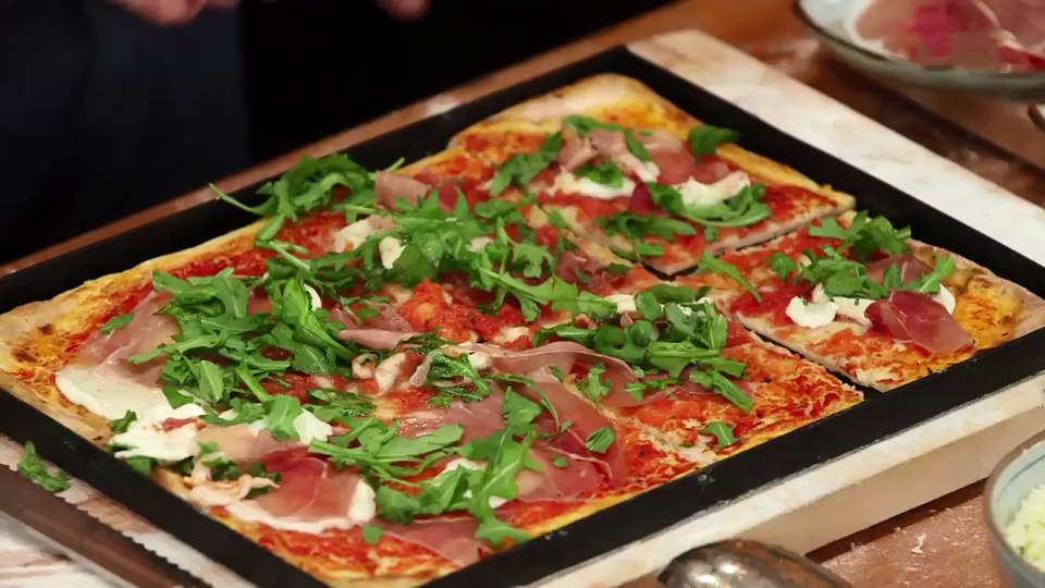 接下来就是披萨最核心的部分——制作馅料,今天,安德鲁要做两种口味的披萨。水牛奶酪披萨要先铺一层番茄酱,放进烤箱里烤4~5分钟(350度为最佳,如果温度达不到,可以多烤一会),拿出以后再铺水牛奶酪烤制,最后铺上意大利特色的帕尔玛火腿和芝麻菜,就可以折起来吃啦!