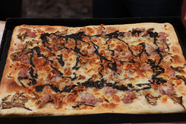 森林披萨则不需要使用番茄酱,先放上蘑菇和盐烤制,然后依次放上意大利碎肉肠、中国核桃、奶酪、松露酱、核桃以后烤制,这种不需要放酱料的披萨,意大利将它称作白边披萨,虽然没有酱料,但是醇醇的面香味、酥酥的面皮、沾满松露酱和奶酪的蘑菇,同样令人爱不释口!