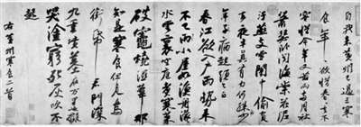 《黄州寒食诗帖》是宋代“尚意”书风的代表。苏轼将诗句心境情感的变化,寓于点画和使转中,用饱蘸情感的笔墨抒写自己复杂的心理状态。通观全帖,有缓起渐快的节奏,有由小及大的字形,有由细变粗的笔画,有始淡终浓的墨趣。其结字亦奇,或大或小,或疏或密,有轻有重,有宽有窄,参差错落,恣肆奇崛,变化莫测。如“年”“中”“苇”“帋(纸)”4字的悬针竖,剑戈森森,在整体布局中起到了突出和支撑作用。一系列变化使作品呈现出不同的节奏韵律,笔墨亦随心境起伏流转,如滔滔江河水宣泄于纸卷之上。《黄州寒食诗帖》正是以尚意抒情的方式,传达了苏轼的美学精神,创造出一种富有生命力的新的行书书写样式。