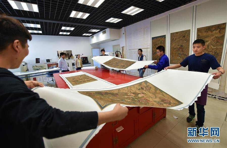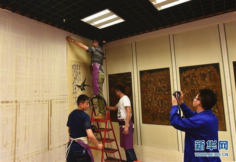 山西博物院书画修复组的修复师们在为古画“上墙”。