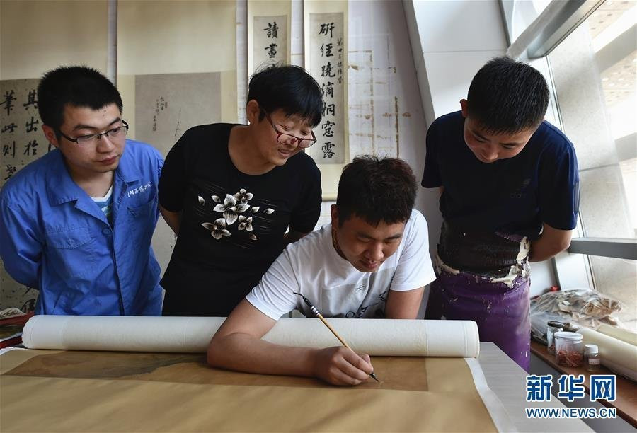 这来自天南海北的“90后”六兄弟因为有着同样的兴趣与梦想而相聚在山西博物院书画修复组。隐补、全色、喷水上墙、下墙……修复一幅古画的步骤非常繁杂,六兄弟在修复室里一站就是八个小时。师父孙华(左二)在指导杨啸(左三)为古画“全色”。