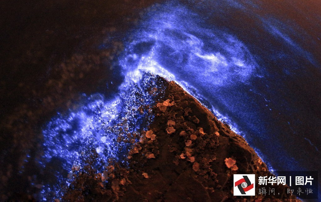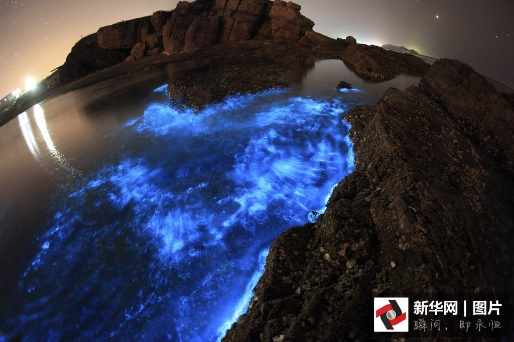 图为辽宁省大连市,大连甘井子区小黑石海域出现“荧光海”景象。最著名的就是波多黎各Vieque岛。海湾里发光的是一种叫做鞭毛藻 (dinoflagellate)的非植物非动物,类似于细菌的单细胞微生物。这个海湾里每加仑的水中有大约72万个这种小东西,它们个头不大, 也就几十微米,按理说,肉眼是根本看不到的。不过,当它受到外界扰动的时候,会象萤火虫一样释放出生物光,这种光的释放其实是鞭毛藻的一种防御功能,令捕食者敬而远之。在漆黑的夜晚,萤火清晰可见,闪亮动人,身临其境,真是感觉宛如仙境。