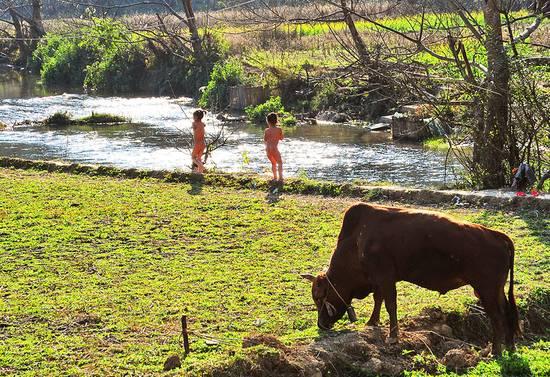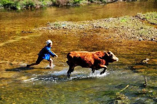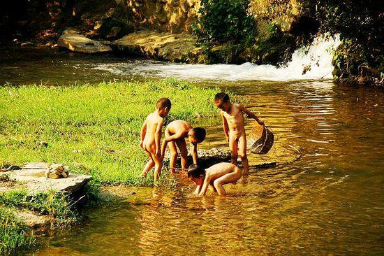 越过田地,环绕在坝美河流的中央有着一个桃花岛,由于河流被小岛分了个岔,所以坝美人称左边是“男河”,右边是“女河”。夏日炎炎之时,辛苦劳作的人 们会赶在太阳下山之前,聚在桃花岛上,然后一头扎进河流中享受天然的沐浴,且男女之间绝不会越“雷池”一步。时至今日,在此沐浴的都是村里的孩子,他们赤 条条地穿梭在两河之间,抓鱼、摸虾、嬉戏,爽朗的欢笑声日日都有。