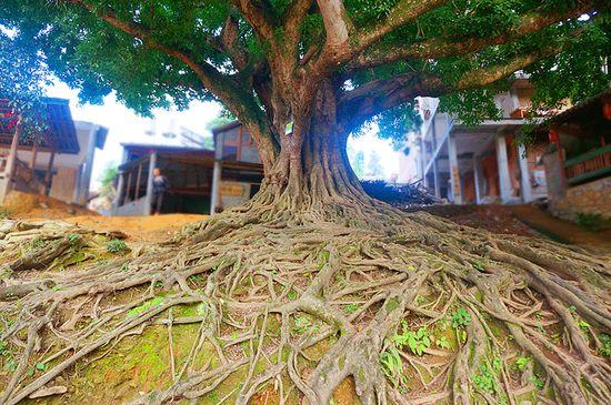 一直往村庄里面走,有着好几棵大榕树,本地最老的老人,也说不透它们的年纪。村民们常在农闲之时,汇聚在大榕树下,男人们坐在一起抽着水烟,讲着今年 的收成,打发着时间。女人们坐在树下一起织布,家长里短地聊着天。小孩则会端着小板凳,静静地听着村里的老人讲着过去的故事:从战乱纷纷的年代到欢歌盛舞 的庆祝;从田里庄稼的种植到坝美村的神话故事。老榕树就是这样一代代承载和见证着坝美的一切。