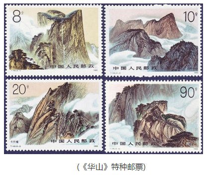 1989年8月25日邮电部发行了名山五岳系列邮票——《华山》特种邮票1套,全套4枚,4-1西岳五峰,面值8分,发行量2370.95万枚;4-2华山远眺,面值10分,发行量2071.75万枚;4-3千尺幢,面值20分,发行量2111.7万枚;4-4苍龙岭,面值90分,发行量2150.7万枚。