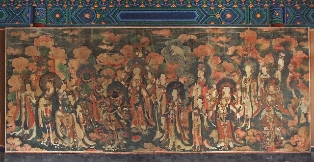 法海寺壁画共十铺,由当时15位宫廷画师精心绘制,面积达236.7平方米,所绘内容均为佛教世界中的景物,有十方佛众、菩萨诸天、飞天侍女等等,神情生动、姿态各异,出神入化,是明代壁画中的最高典范,体现了宫廷绘画的华贵,画师技艺的专精。