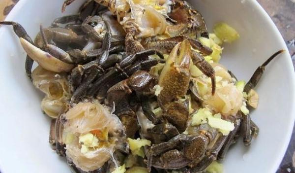 这个是去了壳的的“盘嘎子”,都是小炒加靑辣椒,很少煮和蒸的,记得有次抓了满满一脸盆,去壳后有整整两菜碗,除了背上的壳不吃,螃蟹腿都是直接放嘴里咬着吃的,吃起来嘎吱嘎吱的脆响,因为吃的太多,自此吃腻。"(文章来源:东方网)