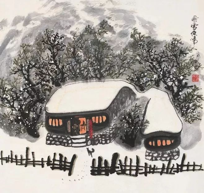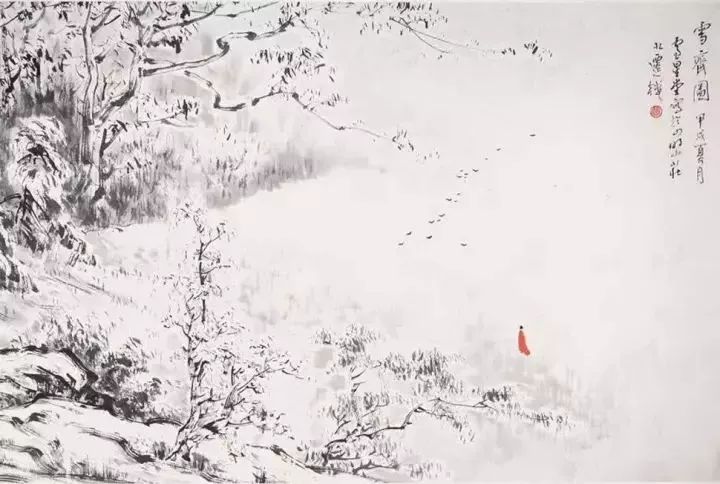 将军发现敌军潜逃,要率领轻装骑兵去追击;正准备出发之际,一场纷纷扬扬的大雪,刹那间弓刀上落满了雪花,苍劲之美跃然纸上。