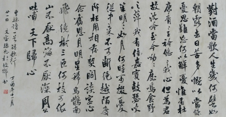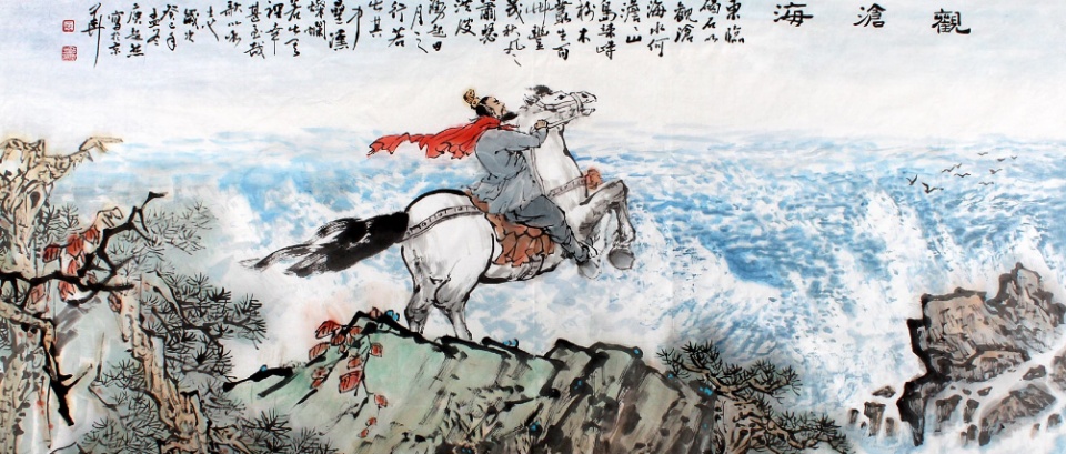 “六分半书”,是郑板桥对自己独创性书法的一种谐谑称谓。隶书中有一种笔画多波磔的“八分书”,所谓“六分半”,其意大体是隶书,但掺杂了楷、行、篆、草等别的书体。《行书曹操诗》轴(如同,现藏扬州博物馆)可视为“六分半”体的代表作。此件写曹操《观沧海》诗,字体隶意浓厚,兼有篆和楷;形体扁长相间,字势方正而略有摆宕,拙朴犷悍,正好符合曹诗雄伟阔大的风格。