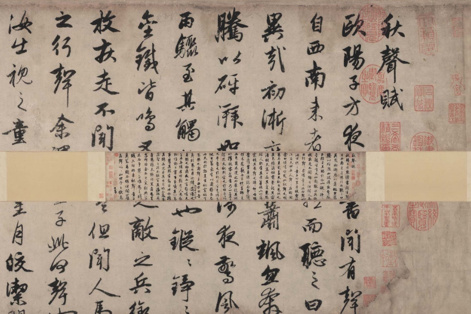 街”,规矩含于纵放之间。看似随笔挥洒,整体观之,却产生跳跃灵动的节奏感。如作于乾隆二十七年(1762年)的《行书论书》横幅,乃晚年佳作。整幅作品结字大大小小,笔画粗粗细细,态势欹欹斜斜,点画、提按、使转如乐行于耳鸟飞于空,鱼游于水,骨力和神采在一种任意的节律中显露出来。