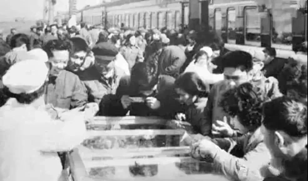 △1980年代途径德州火车站的乘客在抢购扒鸡