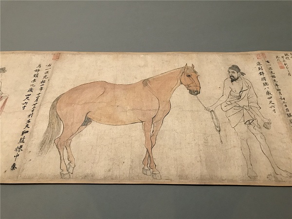此《五马图》手卷,高27.8厘米,全长256厘米,线描墨画淡设色,绘西域所进名马五匹并牵马奚官、弁从五人,均右向立。每匹马后有黄庭坚题记,标明所进马匹时间、出处,名称,年龄、尺寸等细节。一为“凤头骢”,二为“锦膊骢”,三为“好头赤”,四为“照夜白”。惟第五匹缺题,仔细观察第五图,会发现此作笔法等细节与前面明显不同,年份上也显得较新,而且画面纯水墨没有一点设色,可以肯定系后来补绘配入。据周密《云烟过眼录》卷上记载推知,这匹马原先应为“满川花”,本有黄山谷题字云:“元祐三年正月上元□□□进‘满川花’”。