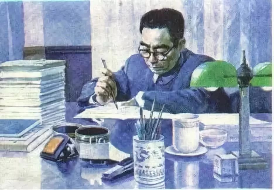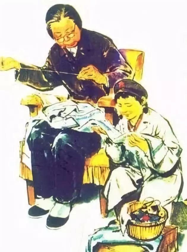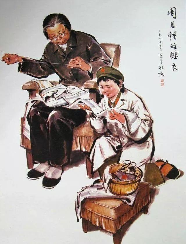 这幅国画描绘的是七十多岁的邓妈妈戴着老花镜给周总理补睡衣,旁边的小护士捧着睡衣望着补丁上又匀又密的针脚湿润了眼睛。