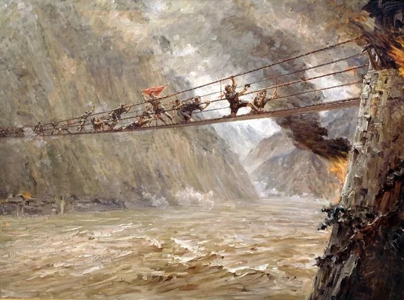 除了这幅画之外,还有另外一幅比较知名的《飞夺泸定桥》。这幅画诞生时间更早,由中国第二代油画家刘国枢于1957年创作,现藏于中国人民革命军事博物馆。