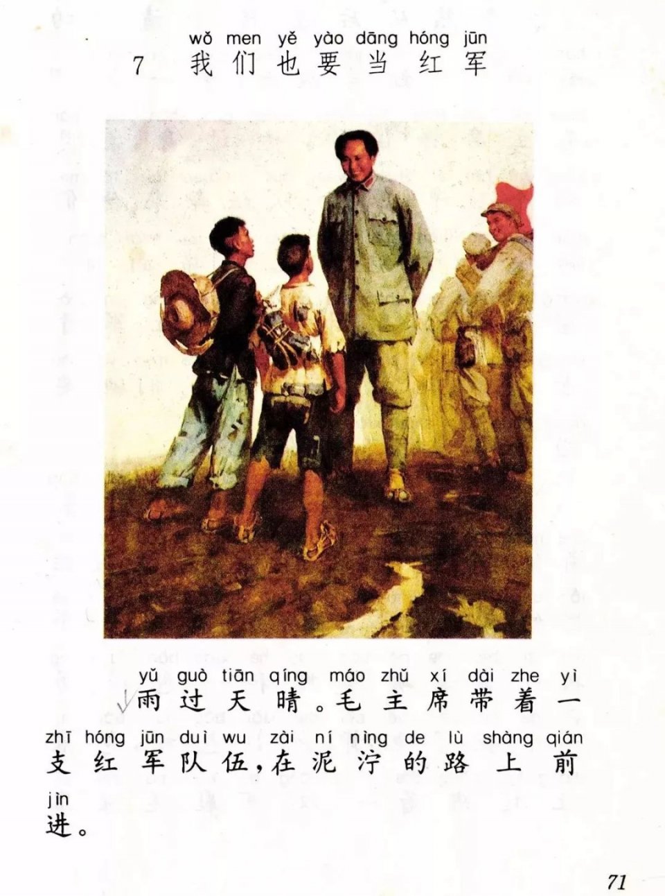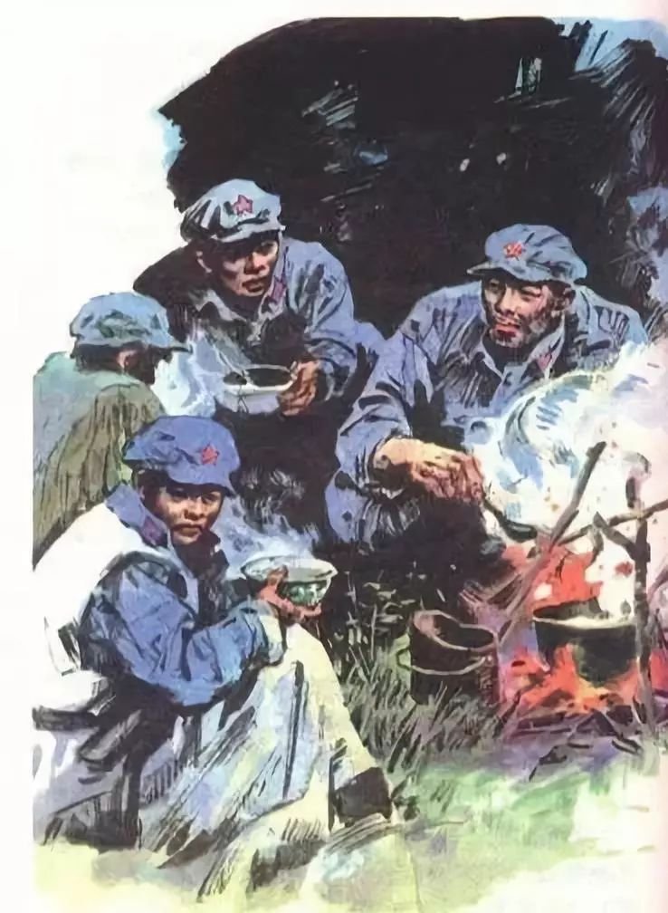 课文《我们也要当红军》,描写的是在荒野茫茫的崎岖山路上,两个历尽辛苦、长途跋涉的贫苦少年,终于赶上红军队伍并要求参军,而毛主席微笑着答应他们参军的场景。课本里有一篇配图,这幅画原名《贫农的儿子》,作者是我国老一代著名画家蔡亮。