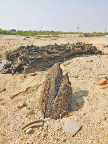 “阴沉木”形态不一,有的只是一截树干,有的是一半树干在外,一半树干在沙滩下,还有的大部分都埋在水面之下,有的则偃卧在流水之中。“阴沉木”的表皮多已剥落、破碎,但质感很硬,体量也很重。