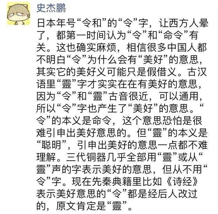 对此特意发出了一条朋友圈进行解释:古汉语里‘靈’字才实实在在有美好的意思,因为‘令’和‘靈’古音很近,可以通用,所以‘令’字也产生了‘美好’的意思。”