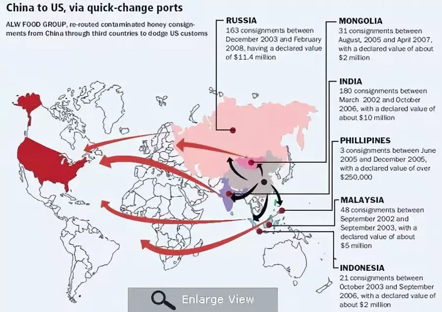 实际上,美国消费的蜂蜜有1/3直接或间接来自中国。为了避免关税,中国蜂蜜出口商先出口到印度、菲律宾和马来西亚,再在当地重新贴标改成当地产品,然后再出口到美国。其他产业也有类似的操作。