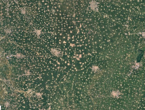 这听起来有点吓人,但实际上绿色的是农田,白色的点是村庄,每个村大约500人。比较大的白色区域是镇,人口从1万到10万不等。