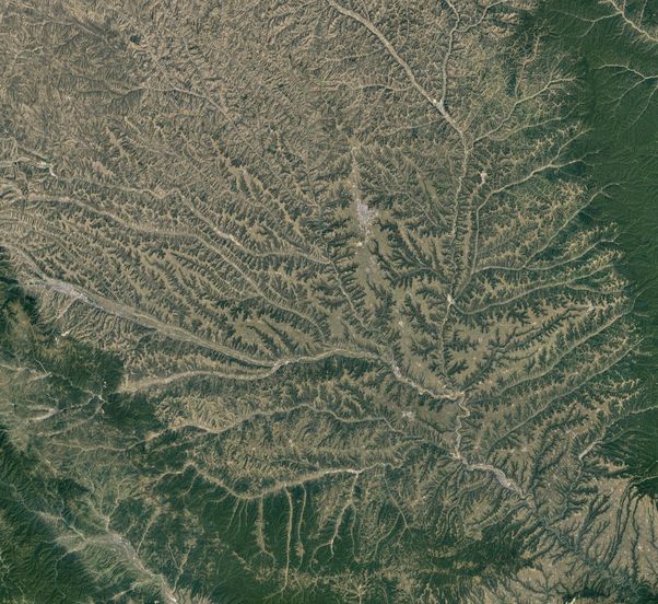 64万平方公里的黄土高原其实不适合种植农作物。但如果你放大看看,就会发现所有山谷、山坡都被开辟成了可耕地。从天上往下看,类似植物根须的地方便是农田。