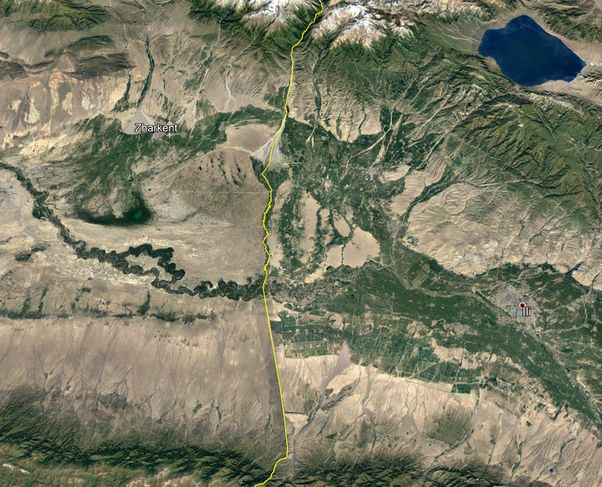 可克达拉是北疆的一个县级市,西边是哈萨克斯坦的阿拉木图地区。下图黄线标出的是中哈边境线。