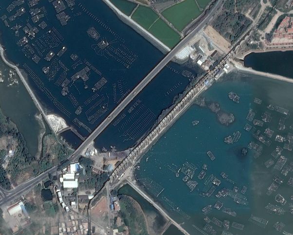把地图放大一点,可以看到海面上漂着上百万个房子和网箱