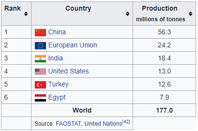 有了大棚蔬菜,中国人享用的蔬菜品种比世界任何地方的人都要多,价格还更便宜。查询维基百科就会发现,除了热带特产以外,中国每一种蔬菜产量几乎都是世界第一,而且跟第二名拉开的差距还不小。许多东亚特有的蔬菜甚至都没有上榜,比如韭菜。